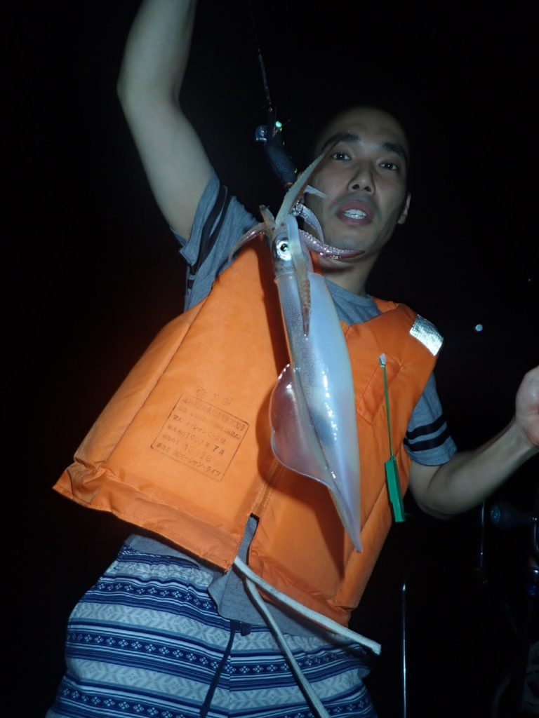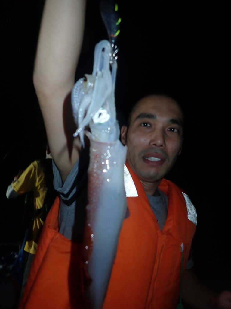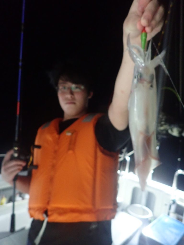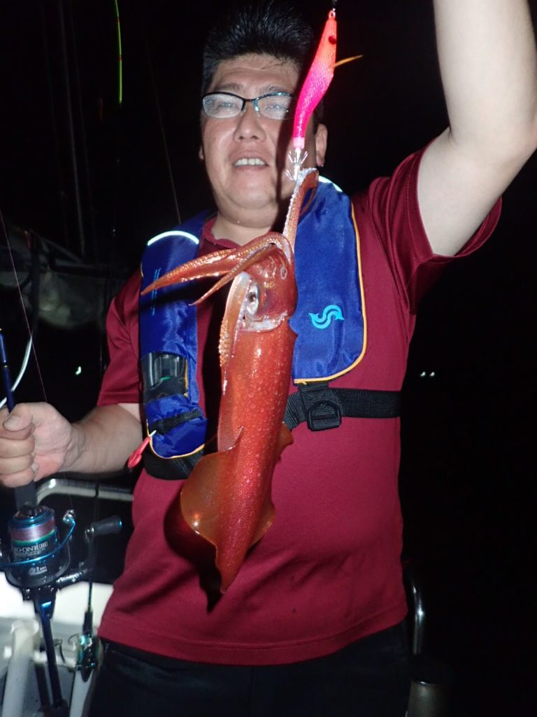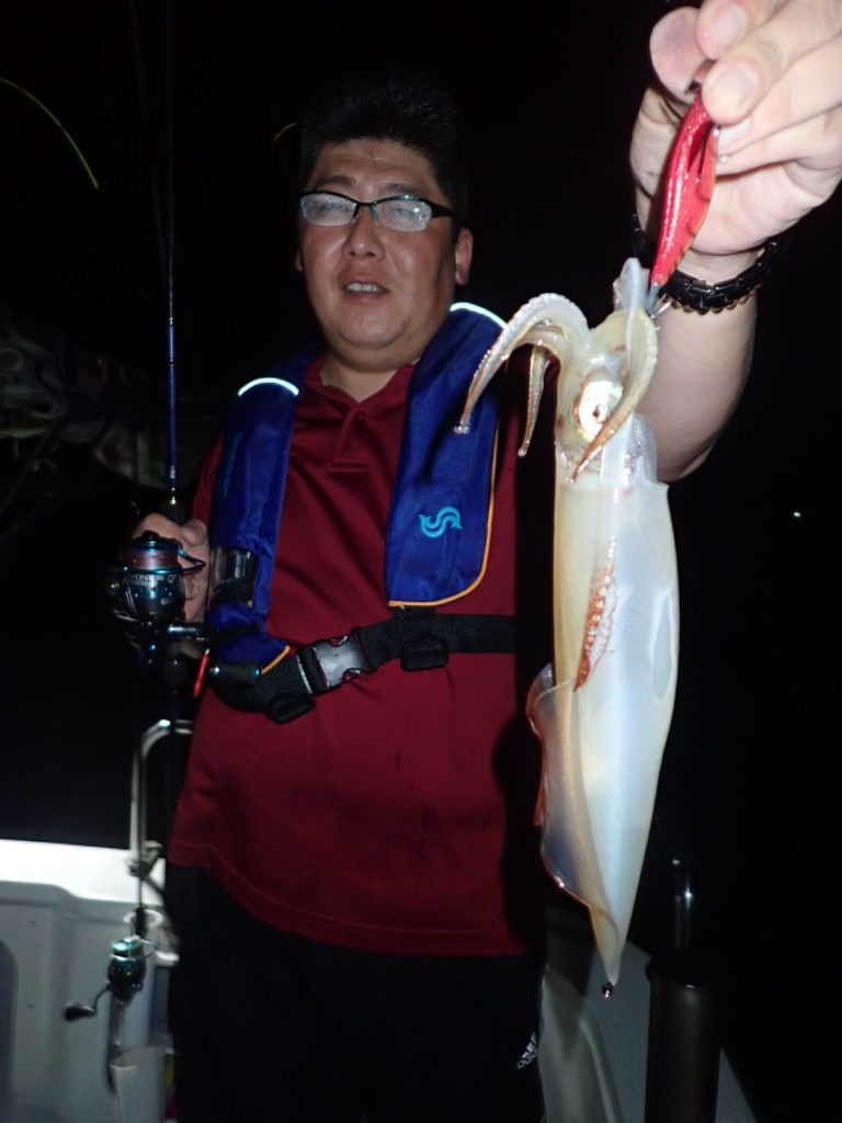 今日は、西からの潮と南からの風で・・イカリを打っている間は・・30号のシンカーでもエギが斜めに出て行き・・全員・・船の片舷で釣っていただかないと・・ラインが船底を擦ってしまうような・・難しい条件・・(汗)