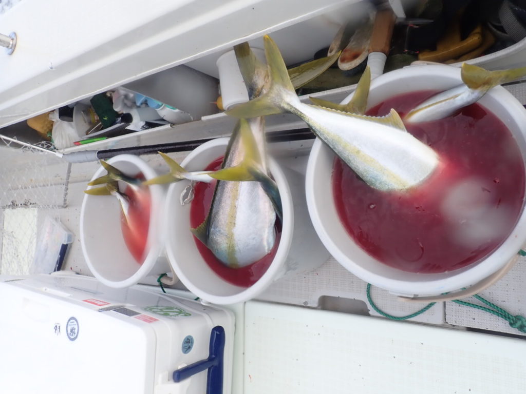 もう1匹ヒラマサを追加したのですが・・後はハマチ・ツバス・・ボコボコと釣れ出したのですが・・風・波が治って来たので・・大物ポイントに行ってみようか・・?と、聞いたところ・・青物はヒラマサで・・ブリならサワラが欲しいとのことで・・再度・・サワラ・サゴシポイントへ・・!!