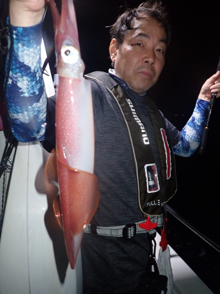 飛んで火に入る夏の虫や飛び魚なら分かりますが・・イカが自ら甲板に飛び込んで・・それもお客様の肩に当たるとは・・珍しいです・・???