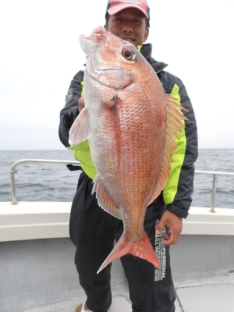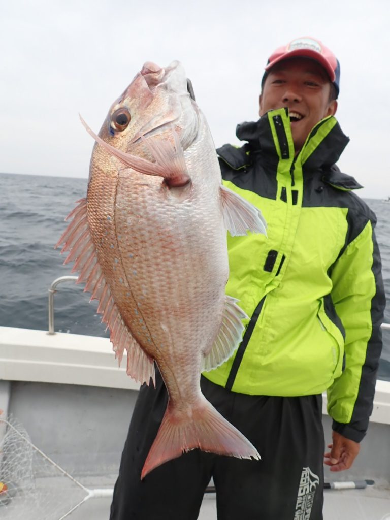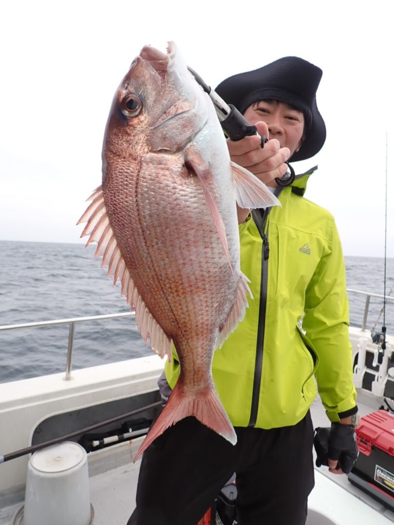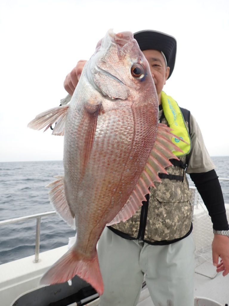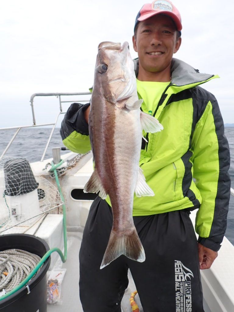 昨日タイラバを持ってこなかったグループでもタイが釣れたポイントで、今日は全員タイラバでやってもらったら良く釣れました・・11時には、同じ魚種ばかり、そんなには要らないようで、次の中深海の美味しい物シリーズに移動・・\(^o^)/
