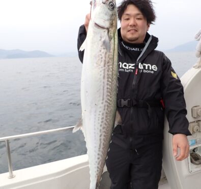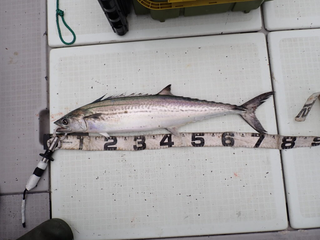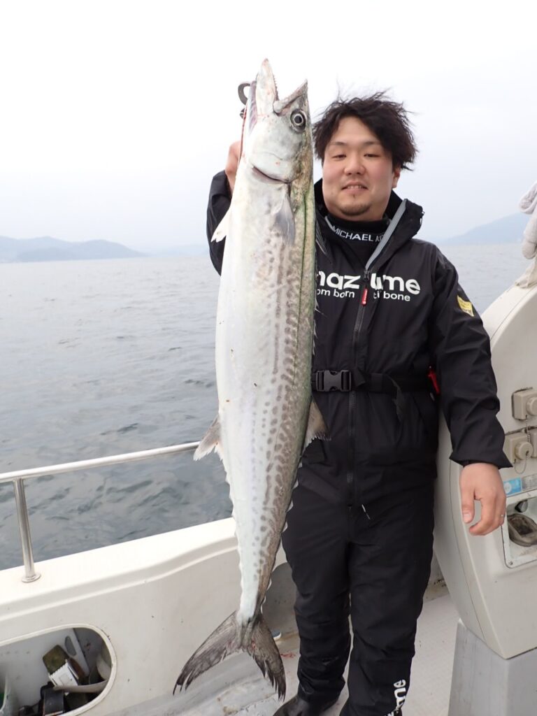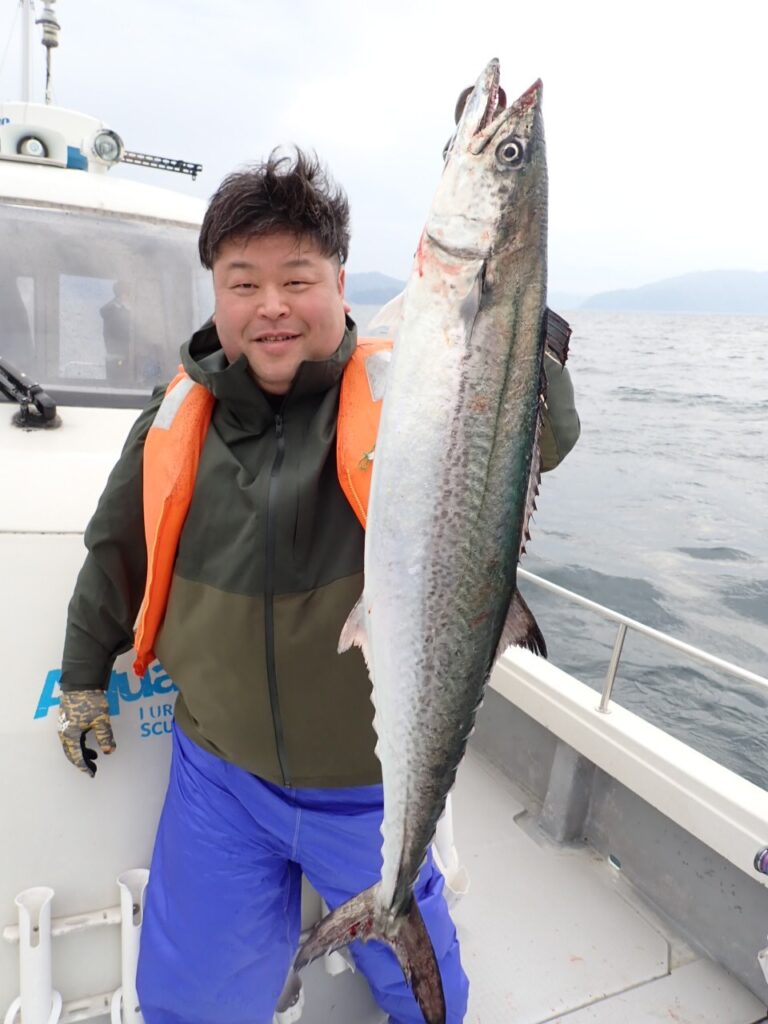 サワラなんかをしていると、朝の青物のジアイには間に合いませんよと説明したのですが、サワラもやりたいとのことでしたので、サワラからスタート・・案の定7発ヒットのサワラ2匹にシーバス・・まあ初心者3名なので仕方ないなぁ〜〜(⌒-⌒; )