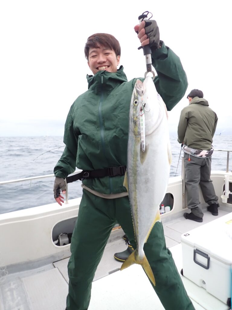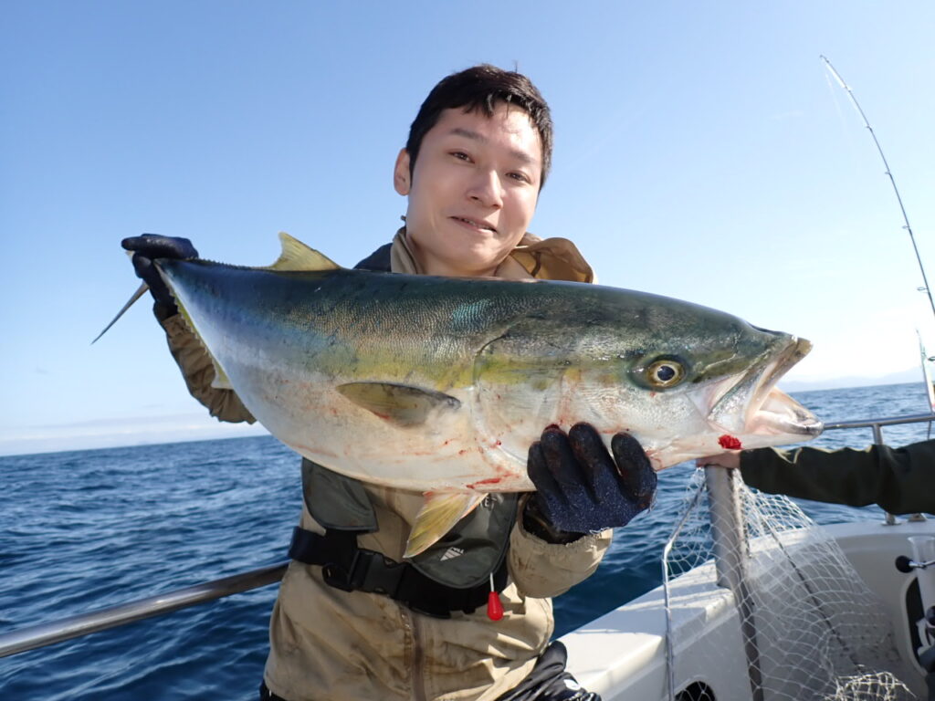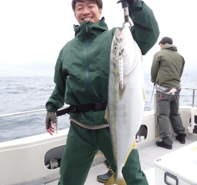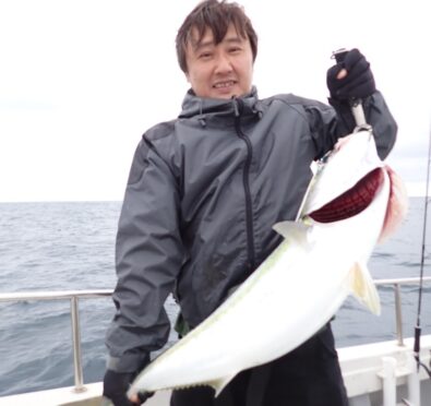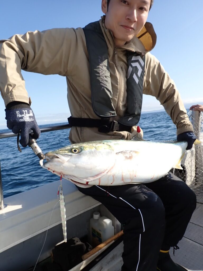 青物を初キャッチの方も居られ、その方が、根掛かりと言って居られたので、スタッフが外しに行って、ベイルを起こして頂き、手でラインを持つなり、魚が付いているよと、ファイト再開・・本日一番大きなブリが揚がって来ました・・(笑)