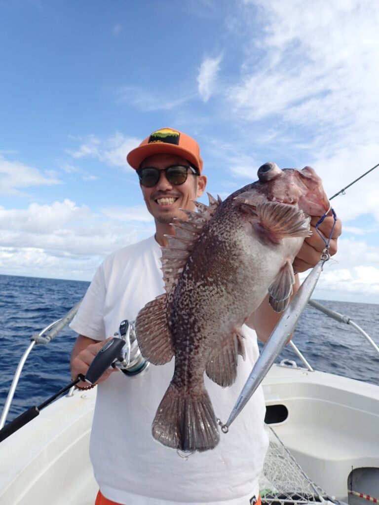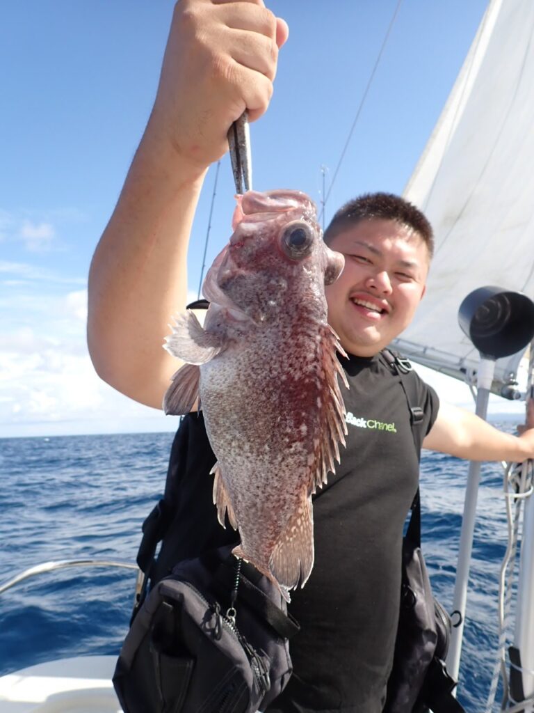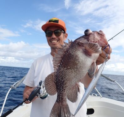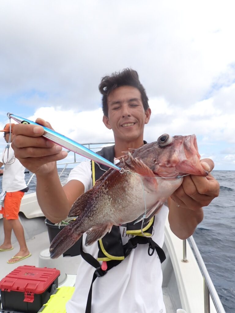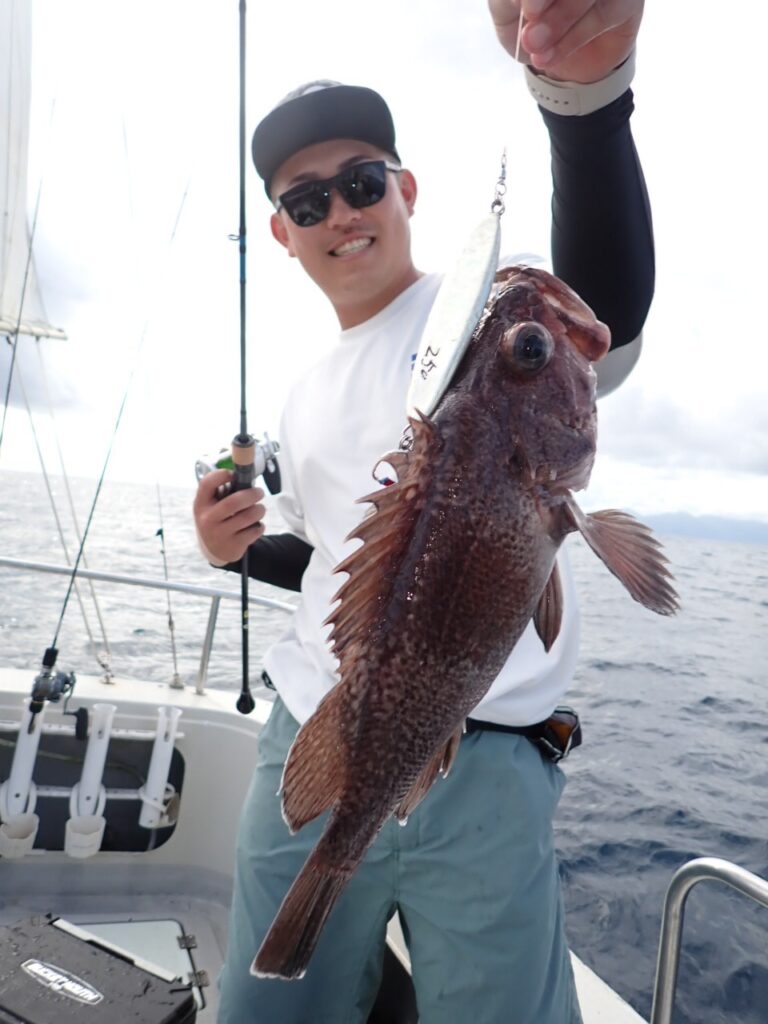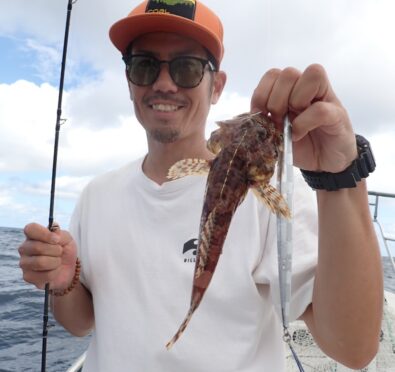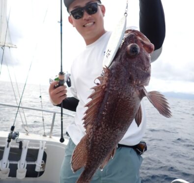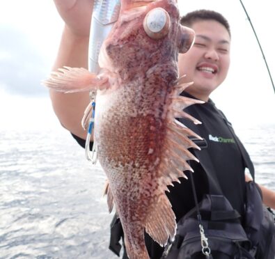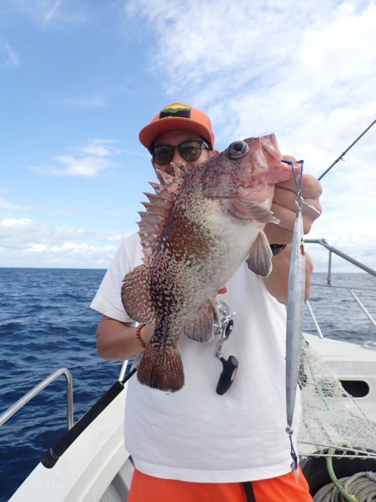 終盤に浅い側もチェックすると、タイ・アコウ・オコゼ・ガシラ・シイラ・マフグなどに加え、ドラグをガンガン引き出す大物(ヒラマサ)?も、2発ヒットしましたが、お二人ともラインブレイクでした・・残念・・(/ _ ; )