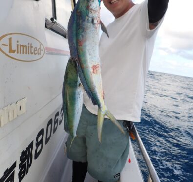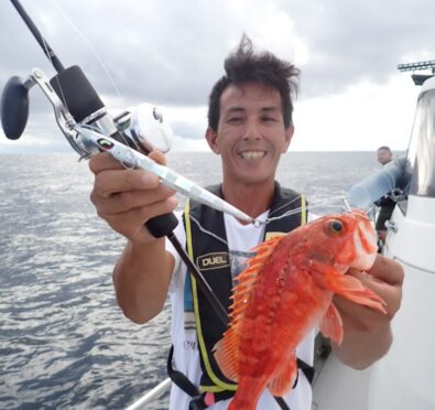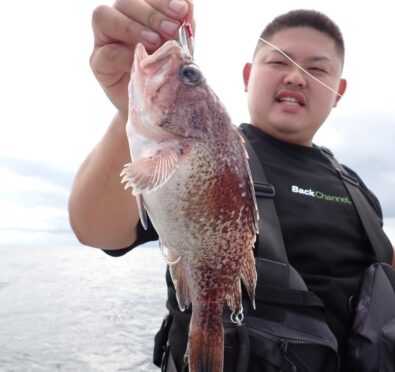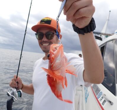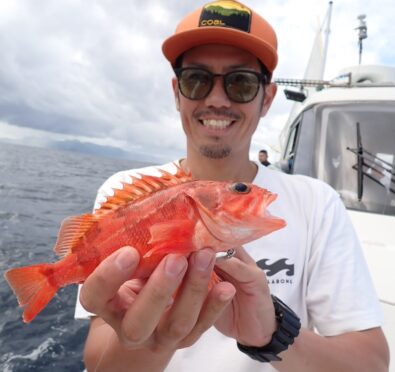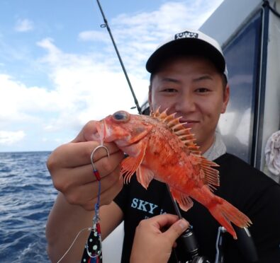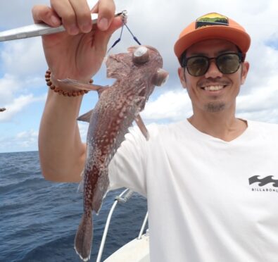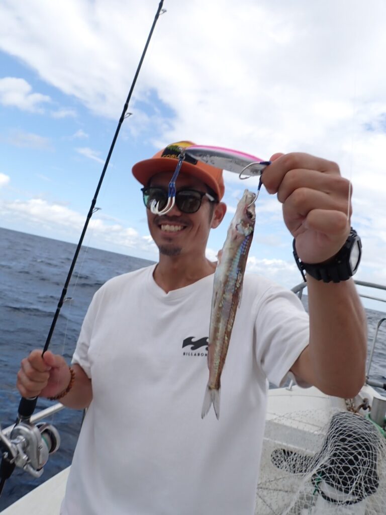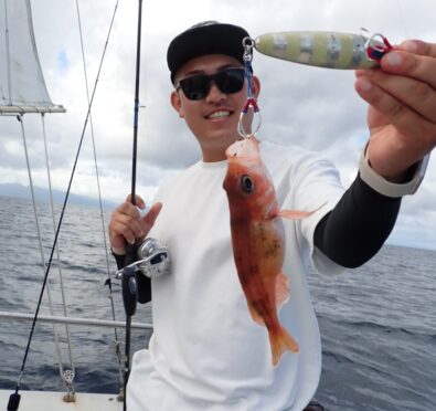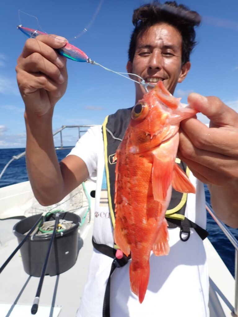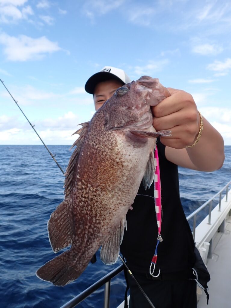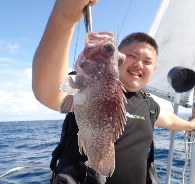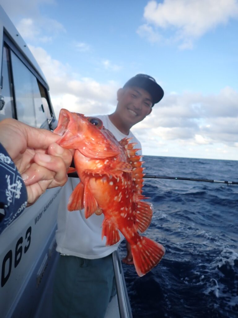 終盤に浅い側もチェックすると、タイ・アコウ・オコゼ・ガシラ・シイラ・マフグなどに加え、ドラグをガンガン引き出す大物(ヒラマサ)?も、2発ヒットしましたが、お二人ともラインブレイクでした・・残念・・(/ _ ; )
